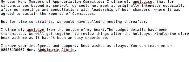 ASB reader, take a look at the text message Abdulmumin Jibrin sent to Appropriations Committee members apologizing for excluding the.